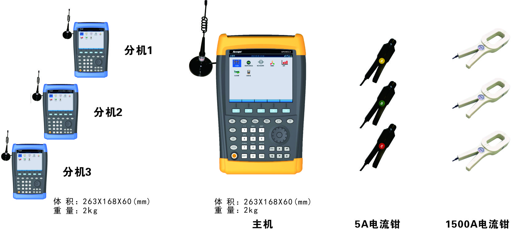 一個(gè)典型的AP2003JC用電稽查系統(tǒng)由一臺(tái)主機(jī)和兩到三臺(tái)分機(jī)組成(分機(jī)數(shù)量可以根據(jù)用戶需求進(jìn)行配置)。適用于檢測具有兩到三臺(tái)或更多變壓器的10KV高壓用戶。主機(jī)和分機(jī)之間無電纜連接,采用無線通訊。主機(jī)只需在高供高計(jì)三相電能表處采樣電壓、電流,而分機(jī)則在變壓器低壓處取樣電壓,并用大電流鉗型表進(jìn)行電流取樣,最后即可在主機(jī)上顯示出整個(gè)系統(tǒng)的綜合誤差。